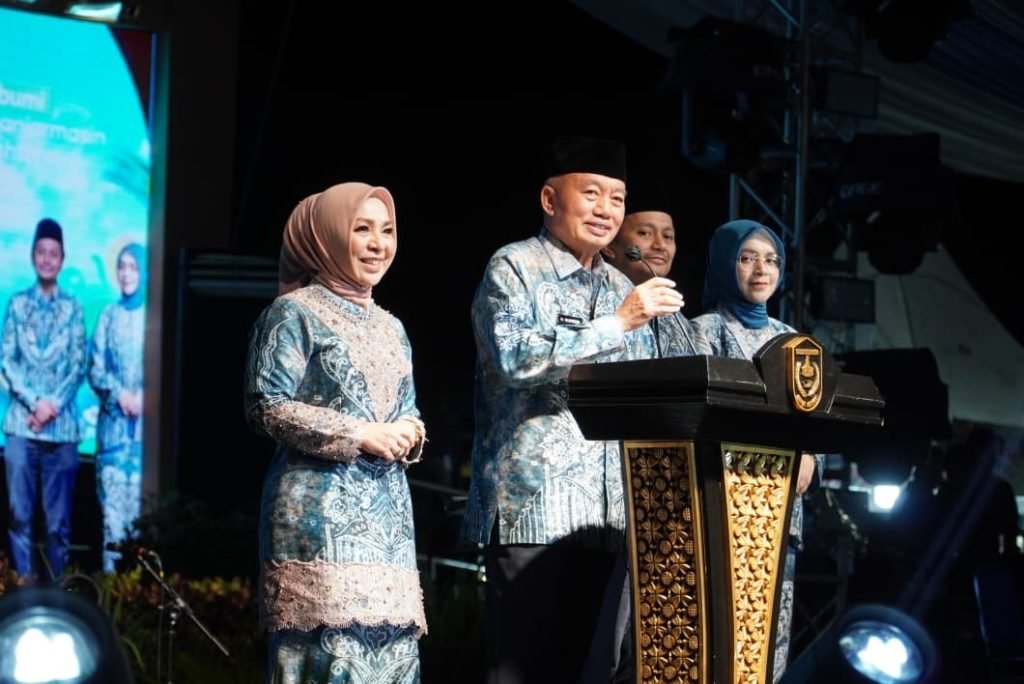 Gubernur Kalsel H Muhidin didampingi Wakilnya Hasnuryadi Sulaiman dan istri saat berpidato di puncak Harjad 499 Kota Banjarmasin, Selasa (30/9/2025) malam. Foto: MC Kalsel