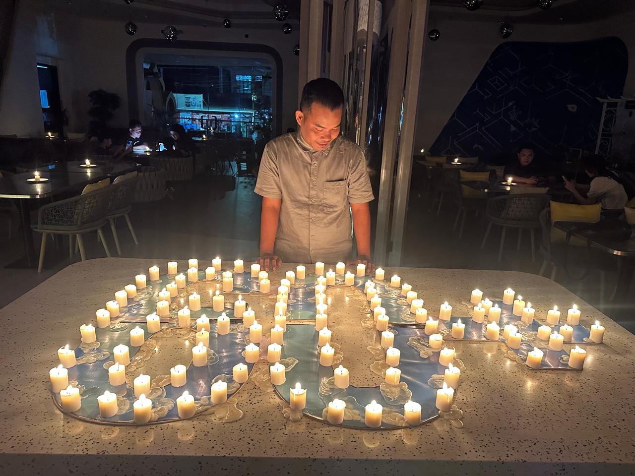 Pemadaman dilakukan mulai dari fasad hotel, area publik, outlet, venue, hingga koridor kamar. Sebagai gantinya, puluhan lilin dinyalakan di area restoran untuk menemani suasana makan malam tamu yang diiringi musik akustik.
