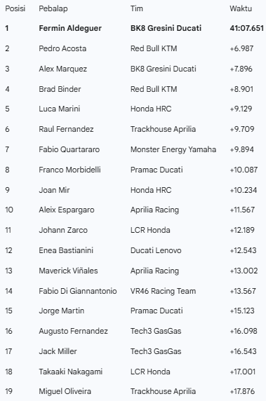 Aldeguer finis terdepan dengan catatan waktu 41 menit 07,651 detik, unggul signifikan hampir tujuh detik dari pesaing terdekatnya. Podium dilengkapi oleh Pedro Acosta (Red Bull KTM) di posisi kedua dan Alex Marquez (BK8 Gresini Ducati) di posisi ketiga.