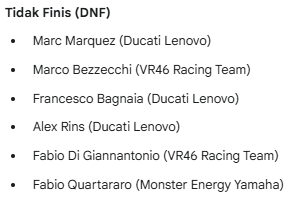 Marc Marquez (juara dunia 7 kali) dan Marco Bezzecchi (juara Sprint Race sehari sebelumnya) terlibat senggolan fatal yang membuat keduanya terjatuh ke gravel dan harus mengakhiri balapan lebih cepat. Insiden ini memastikan “Kutukan Mandalika” berlanjut bagi Marc Marquez yang belum pernah finis di sirkuit ini.
