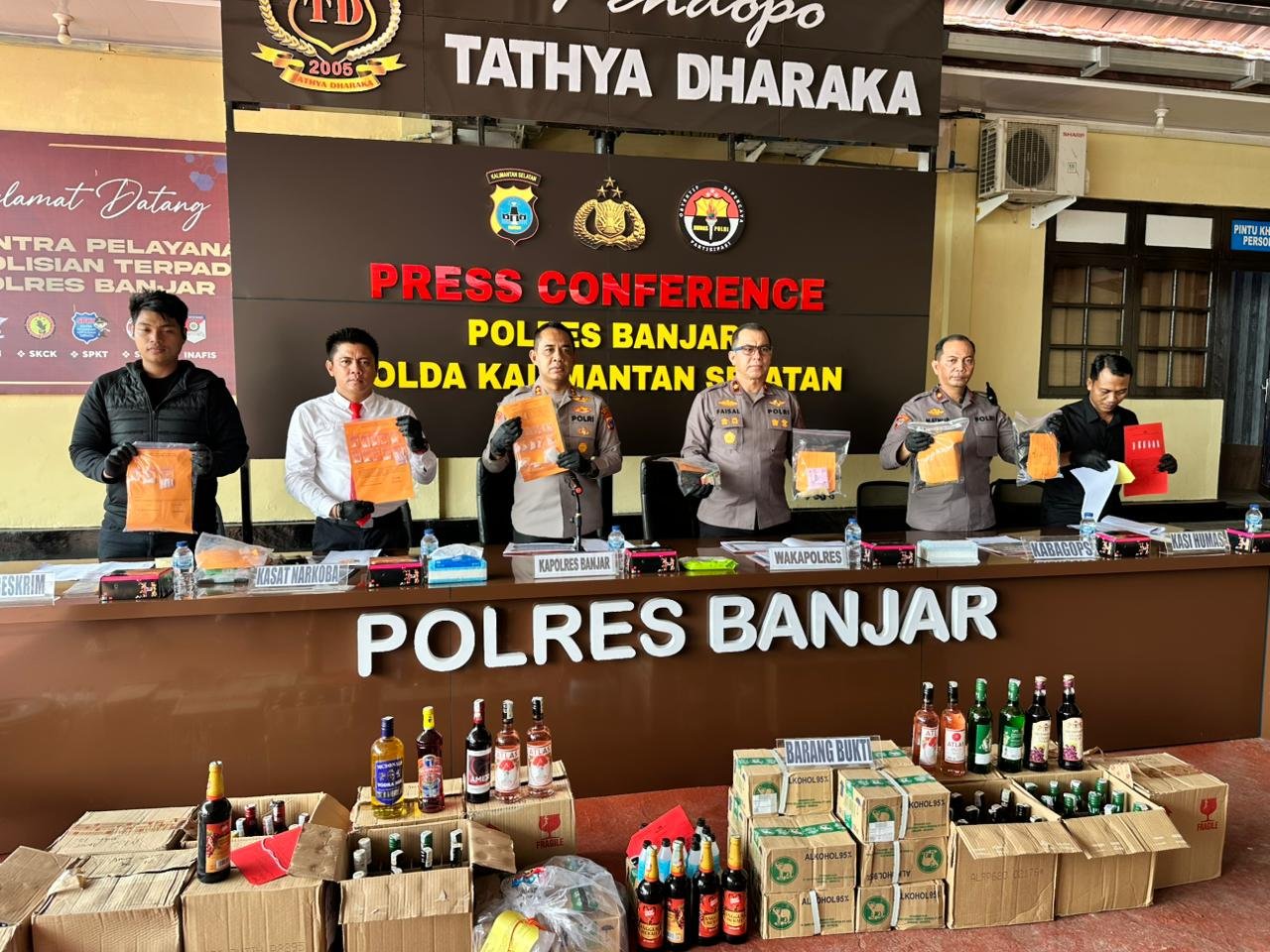 Selain narkoba, Polres Banjar juga menyasar peredaran miras yang kerap memicu gangguan kamtibmas. Petugas menyita 161 botol miras berbagai merek serta 11 dus (264 botol) alkohol merek Gajah Duduk dari para pedagang di wilayah Martapura, Sungai Tabuk, Sungai Pinang, dan Gambut.