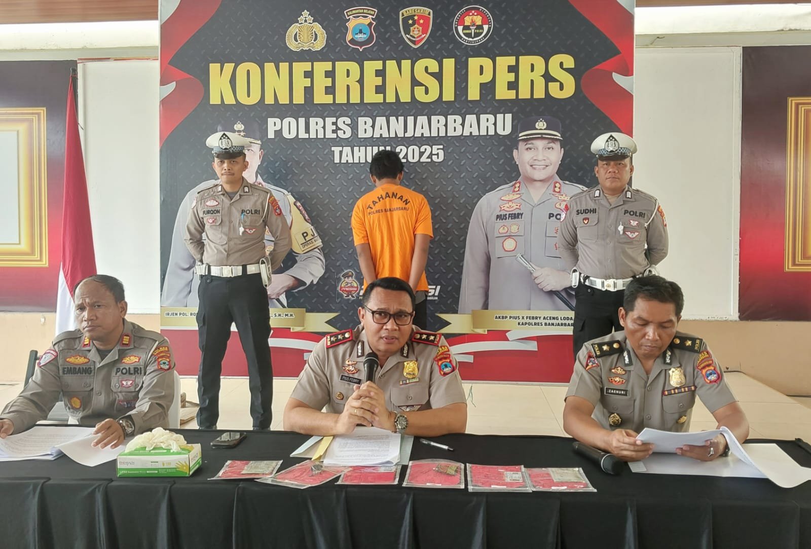 Kapolres Banjarbaru, AKBP Pius X Febry Aceng Loda, menceritakan kronologi kejadian kecelakaan maut di Jl Trikora Banjarbaru, dalam konferensi pers, Selasa (2/12/2025). Foto: Hendra Lianor