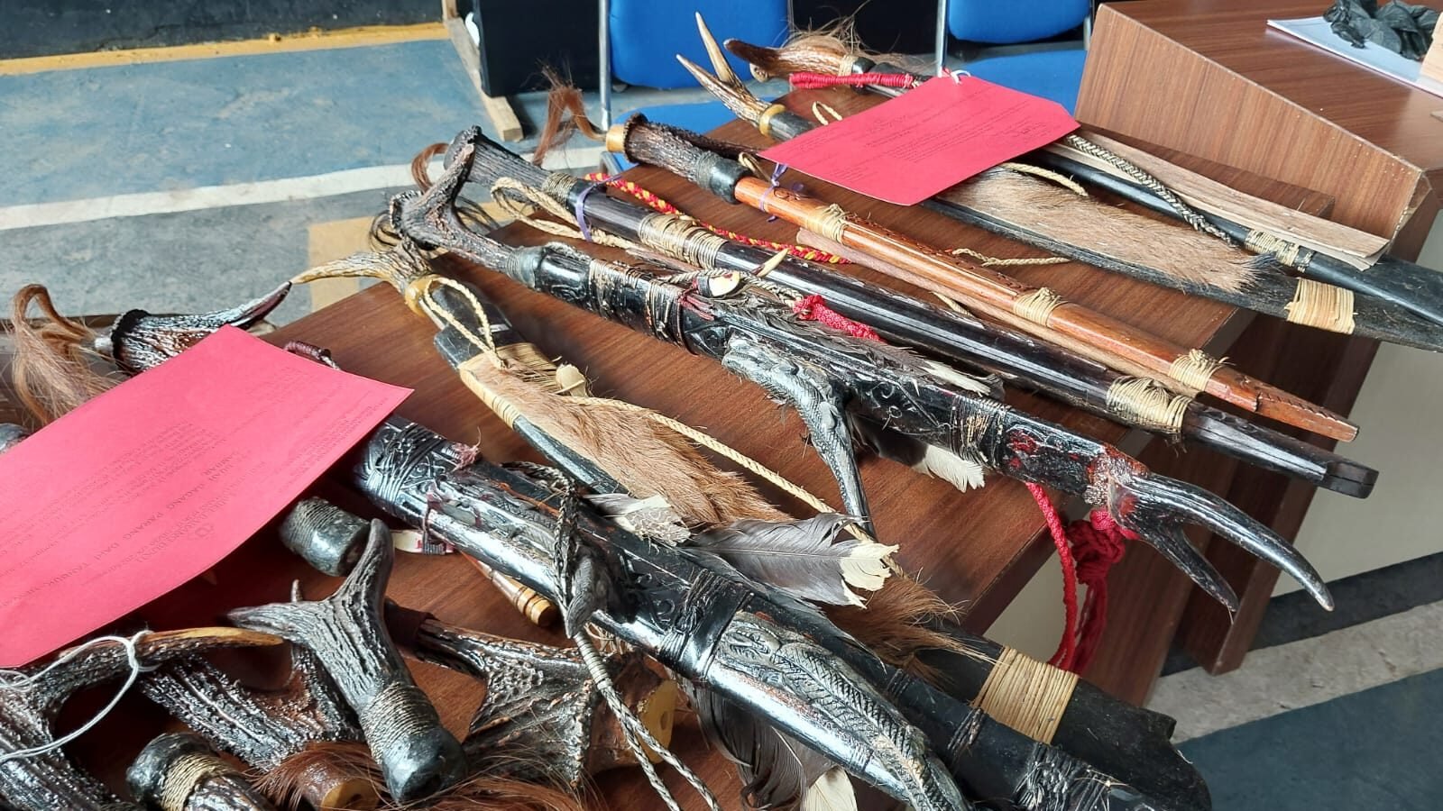 Mandau dan pipa rokok dari Satwa: 29 mandau bergagang tanduk rusa, 77 gagang parang dari tanduk rusa, serta 58 pipa rokok dari tanduk kijang.