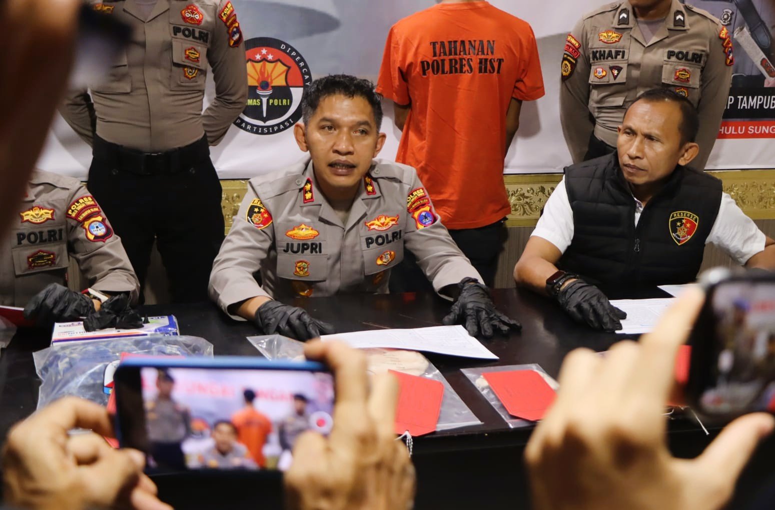 Kapolres HST, AKBP Jupri JHP Tampubolon, saat konferensi pers kasus pria mabuk banting bayi, Rabu (24/9/2025). Foto: Humas Polres HST