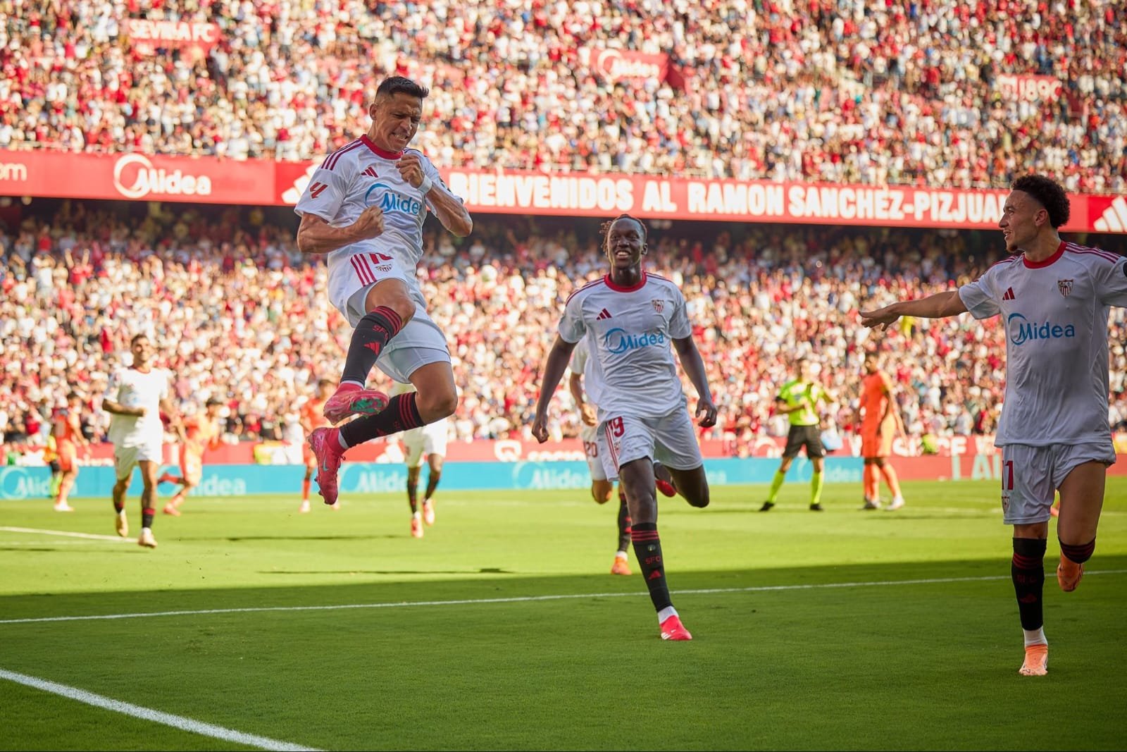 Penyerang Sevilla, Alexis Sanchez, melakukan seleberasi usai membobol gawang FC Barcelona melalui titik putih. Foto: SevillaFC_ENG/X