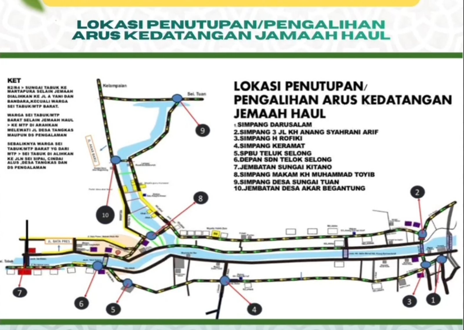 ”Kendaraan roda dua maupun roda empat dari arah Sungai Tabuk menuju Martapura (selain jamaah haul) akan dialihkan melalui Jalan Ahmad Yani atau jalur Bandara,” ujar Iptu Agung.
